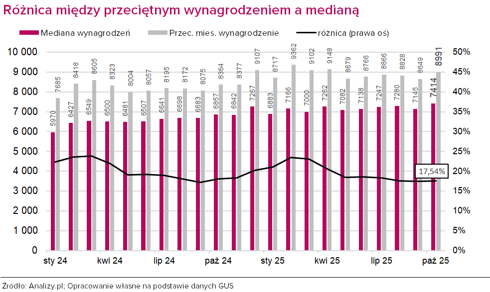 W październiku 2025 r. mediana wynagrodzeń miesięcznych brutto w gospodarce narodowej była niższa o ponad 17,5% od przeciętnego miesięcznego wynagrodzenia brutto w tym miesiącu. To jedna z mniejszych różnic w obu wartościach, odkąd GUS publikuje te dane. Niższa była jedynie we wrześniu 2024 roku (17,2%) i we wrześniu 2025 r. (17,4%), a niemal identyczna w sierpniu 2025 (17,5%).