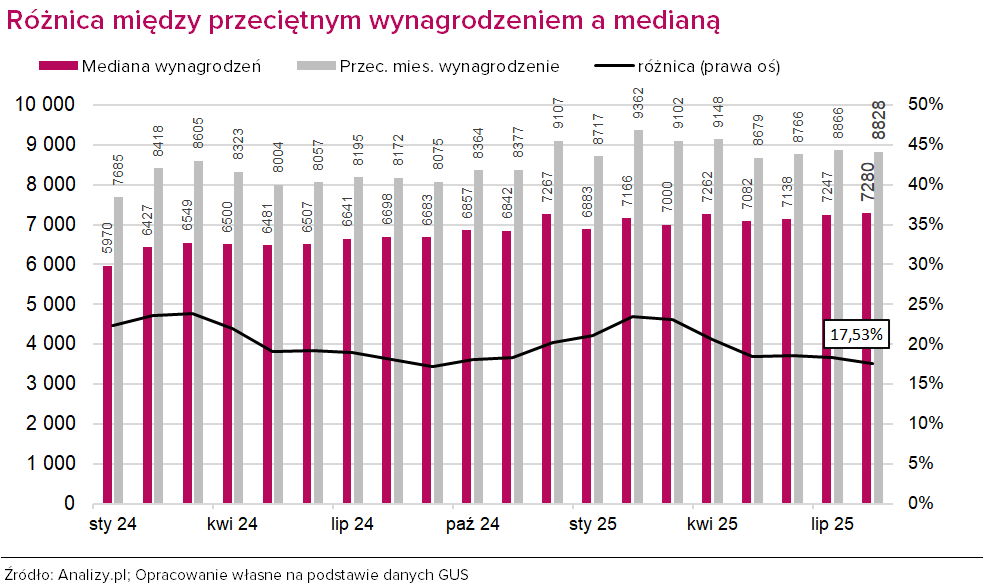 W sierpniu 2025 r. mediana wynagrodzeń miesięcznych brutto w gospodarce narodowej była niższa o 17,5% od przeciętnego miesięcznego wynagrodzenia brutto w tym miesiącu. To jedna z mniejszych różnic w obu wartościach, odkąd GUS publikuje te dane. Niższa była jedynie we wrześniu 2024 roku (17,2%).