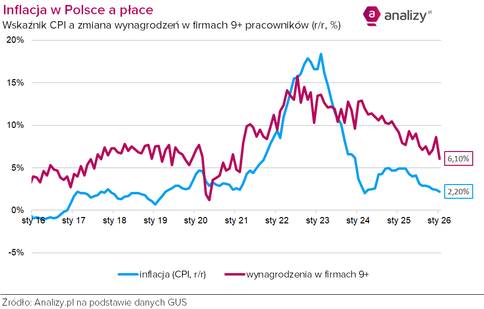 W styczniu 2026 roku przeciętne miesięczne wynagrodzenie brutto w sektorze przedsiębiorstw wyniosło 9002,47 zł, tj. wzrosło nominalnie o 6,1% w porównaniu ze styczniem poprzedniego roku. To wzrost wyraźnie słabszy, niż zakładał konsensus (7,2%), i słabszy od tego z grudnia (8,6% r/r). Zarazem to pierwszy słabszy odczyt po dwóch z rzędu wyraźnie powyżej prognoz.