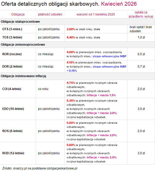 - Obligacje ROR: Roczna obligacja o zmiennym oprocentowaniu, której kupon ustalany jest na bazie stopy referencyjnej NBP, której wysokość określają decyzje Rady Polityki Pieniężnej (RPP). W kwietniowej ofercie oprocentowanie obligacji ROR w pierwszym miesiącu wynosi 4,00% (spadek z 4,25%) w skali roku. W kolejnych miesięcznych okresach odsetkowych oprocentowanie jest równe stopie referencyjnej NBP, która od 5.03.2026 r. wynosi 3,75% i marży 0,00%. Odsetki są wypłacane co miesiąc. Za przedterminowy wykup musimy zapłacić 0,5 zł, nie więcej niż narosłe odsetki.