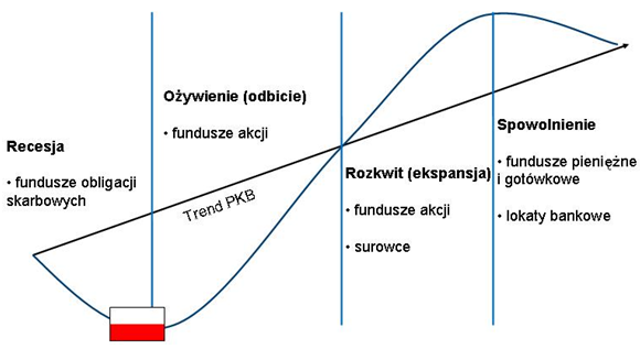 Myśląc o inwestowaniu zazwyczaj mamy przed oczami konkretne rozwiązania – akcje spółek giełdowych, obligacje skarbu państwa, papiery korporacyjne, czy też fundusze inwestycyjne o najróżniejszej polityce inwestycyjnej. I choć narzędzie jest bardzo ważne, bo to ono determinuje zmienność wartości inwestycji i potencjalną stopę zwrotu, to kluczowa jest umiejętność wyboru rozwiązania dostosowanego do aktualnego etapu cyklu koniunkturalnego (gospodarczego). W tym celu pomocne będzie zrozumienie, czym ów cykl się charakteryzuje.