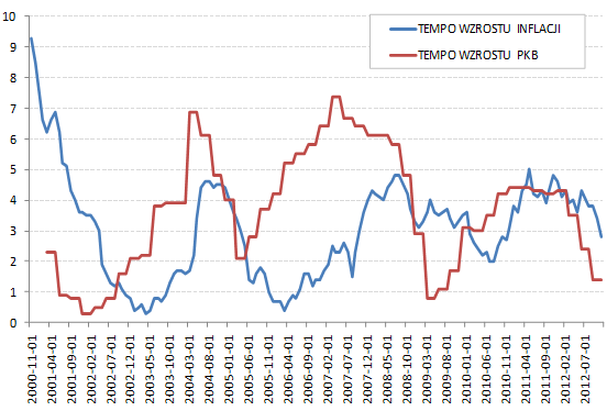 Od dłuższego czasu obniża się tempo wzrostu polskiego PKB. Według szacunków GUS, polska gospodarka rosła w całym 2012 roku w tempie 2 proc. wobec 4,3 proc. w roku 2011. Obserwujemy coraz słabsze dane o produkcji przemysłowej czy sprzedaży detalicznej. Jednocześnie w Polsce dynamicznie spada inflacja – w grudniu spadła do 2,4 proc., a zatem poniżej celu inflacyjnego NBP. To znak, że zbliżamy się do dołka spowolnienia gospodarczego.