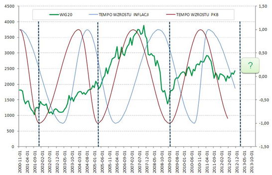 Jeżeli na dynamikę PKB i inflacji nałożymy wykres indeksu WIG20, to granatowe przerywane linie na poniższym wykresie wskazują na momenty wejścia w akcje w dołku dynamiki PKB. Jak widać, zawsze, analizując okres od 2000 roku, były one korzystne dla inwestorów.