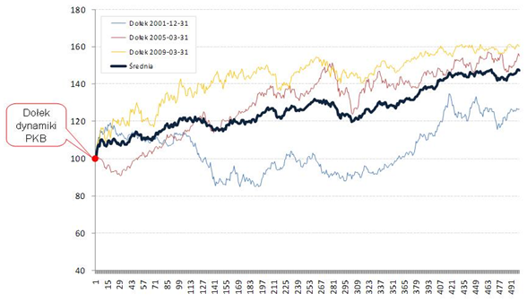 Wszystkie historycznie scenariusze w okresie dwóch lat po dołku dynamiki PKB przyniosły wzrosty wartości indeksów warszawskiej giełdy: minimum 26 proc., maximum 60 proc., średnia 47 proc. Oczywiście należy też pamiętać, że w czasie hossy zdarzają się korekty. Gdy spojrzymy z perspektywy czasu na wzrosty z 2001 roku (wykres niebieski) okazuje się, że najlepszym momentem do wejścia w akcje z WIG20 był tzw. „drugi dołek” z lipca 2002. Podobna sytuacja miała miejsce w 2005 roku (wykres czerwony). Wówczas, zanim WIG20 wszedł na dynamiczną ścieżkę wzrostu, mieliśmy do czynienia z około 8-proc. korektą.