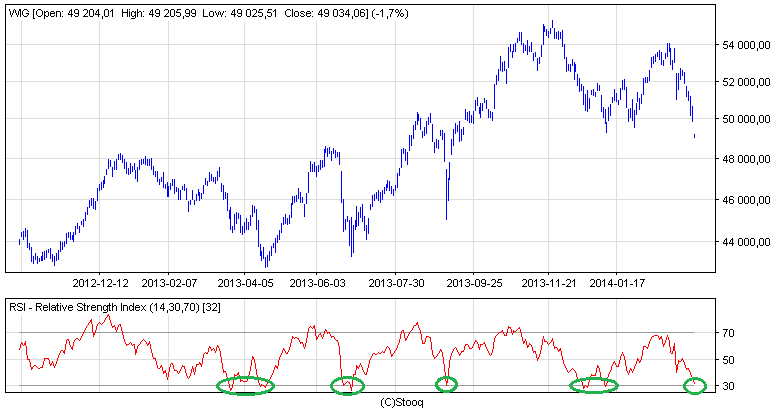 Rys. WIG (góra) i wskaźnik RSI (dół)