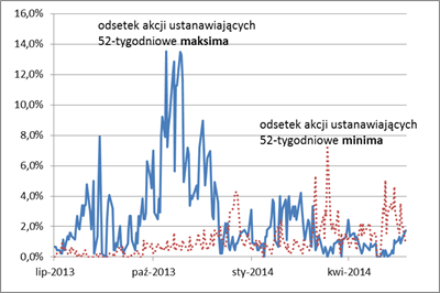 Rys. Odsetki akcji ustanawiających danego dnia roczne maksima i minima