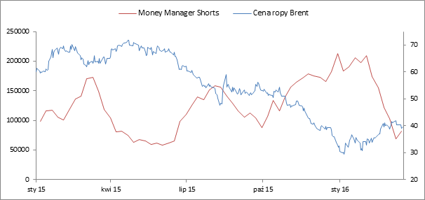 I tak się stało również tym razem. Ilość otwartych krótkich pozycji na kontrakty terminowe na ropę znalazła się na wysokim poziomie w styczniu i lutym 2016 roku i wtedy właśnie byliśmy świadkami rekordowo niskiej ceny ropy naftowej. Wraz z rozpoczęciem procesu „wykolejania krótkich pozycji” czyli „short squeeze”, ropa naftowa gwałtownie odbiła kreśląc bardzo wyraźną literę V. To odbicie od niskich poziomów ($27/baryłkę), do dnia dzisiejszego już stanowi wzrost o około 70%! O ile jakość tego wzrostu może budzić racjonalne wątpliwości jako jedynie spekulacyjne odreagowanie, które może za chwilę zmienić kierunek (i najprawdopodobniej zrobi to jeszcze kilkakrotnie), sprawia że dalsze spadki ropy poniżej styczniowych minimów nie są przesądzone. Mało tego, pojawiają się opinie, że w przypadku kontynuacji trendu potwierdzonej relatywnie dobrymi danymi makro, jest możliwość średnioterminowego odwrócenia kierunku zmian cen.