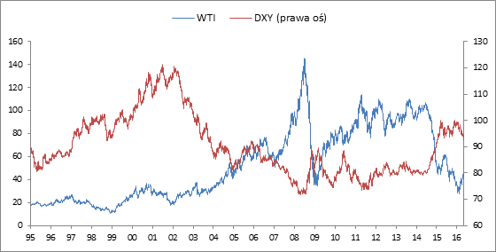 Wykres2. Cena ropy naftowej WTI i indeks dolara amerykańskiego