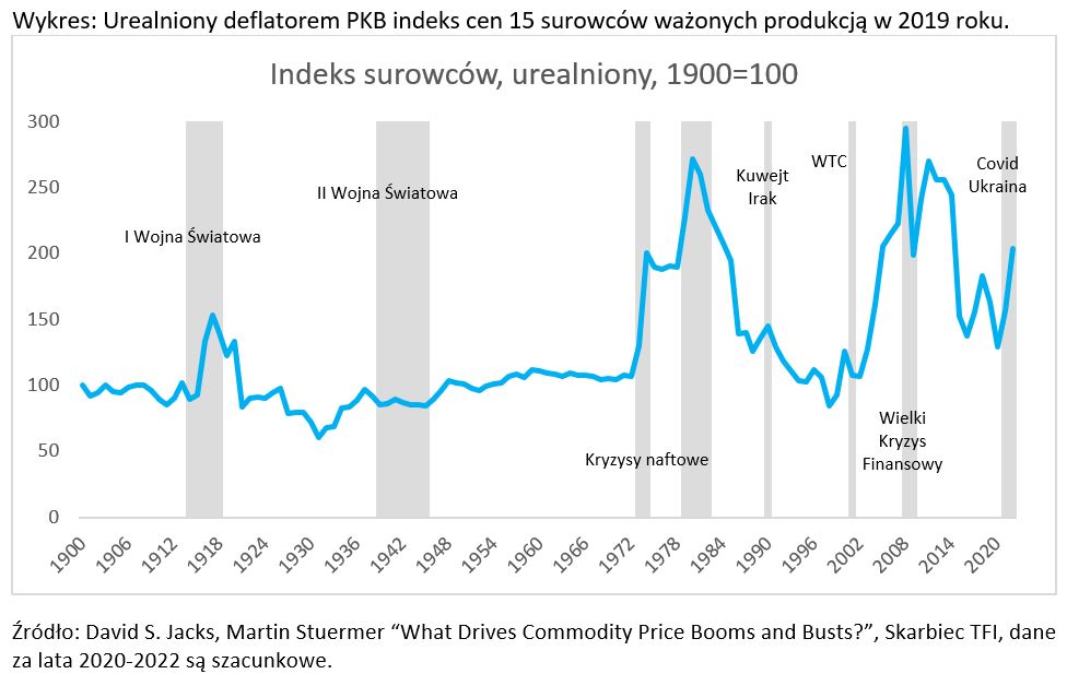 Historia jest pełna dramatycznych zwrotów na rynkach surowców. Powyższy wykres pokazuje, że patrząc na początek XXI wieku, gdy motorem wzrostu cen była globalizacja, lub na lata 70., gdy były nim mocno osadzone w polityce międzynarodowej, szoki podażowe, najbardziej dynamiczne zmiany cen związane były z geopolityką lub gwałtownym rozminięciem się podaży i popytu. Obecnie doświadczamy jednego i drugiego. Na marginesie, w oczy rzuca się niska zmienność w okresie obu wojen światowych. Wzrost w czasie trwania Wielkie Wojny nastąpił w roku 2017, wraz z obaleniem caratu w Rosji.