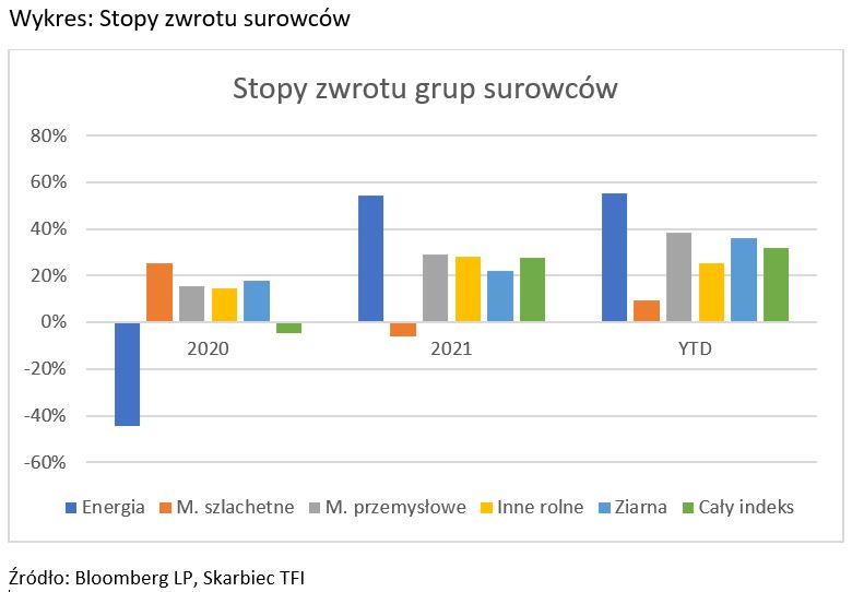 Hossa lub bessa na rynku surowców nigdy nie dotyczy wszystkich surowców. W minionych dwóch latach pozycję lidera przejmowały energia i metale szlachetne. W tym roku obserwujemy kolejne przetasowania, które napędzają globalne czynniki. Szeroki rynek surowców reprezentowany przez wyliczany przez Bloomberg LP (dalej „Indeks”) wzrósł w 2021 roku o 27,1%, a w tym roku (na 8 marca) o 39%. Głównymi motorami są węglowodory, które mają też największy udział w tym wskaźniku. Subindeks surowców energetycznych zyskał w tym okresie 63,5%, tuż za nim uplasował się subindeks metali przemysłowych z wynikiem 63,3%. W 2020 w czołówce stóp zwrotu znalazły się srebro: +47,4% i złoto +24,4%. Warto jednak zauważyć, że Indeks stracił w tamtym roku 3,5%, a to za sprawą taniejącej ropy.