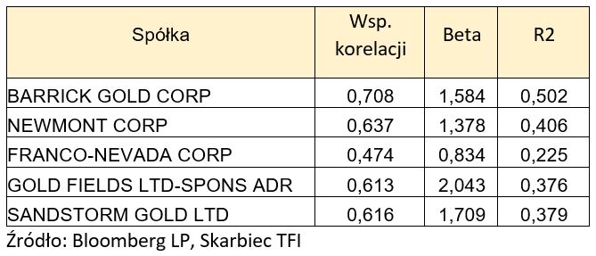 Powyższa tabela przedstawia statystyczne parametry pięciu największych firm wydobywających złoto. Współczynnik korelacji mówi nam, jaka mocno zmiany cen akcji danej spółki są związane z cenami złota. Współczynniki są dodatnie, co dobrze wróży, jednak nie przekraczają 70%. Wskaźnik Beta pokazuje jak zmienia się cena akcji w zależności od jednostkowej zmiany ceny złota. Betą na rynkach posługujemy się często, opisuje siłę związku danego waloru z rynkiem zazwyczaj indeksem giełdowym. W tym wypadku bazą jest rynek kasowy złota. Pomijając jeden przypadek, wszystkie spółki mają wysoką albo bardzo wysoką betę, co oznacza, że ich ceny zmieniają się znacznie bardziej niż ceny złota, także podczas spadków. Trzeci parametr, współczynnik determinacji R2, daje nam podpowiedź o sile związku statystycznego zmian cen akcji tych spółek i złota. Może on przybierać wartości od 0 do 1. Otrzymane w powyższej tabeli wartości nie wskazują na dużą siłę związku. W zasadzie tylko spółka Barrick Gold ma te wskaźniki uzasadniające użycie jej jako substytutu bezpośredniej ekspozycji na złoto.