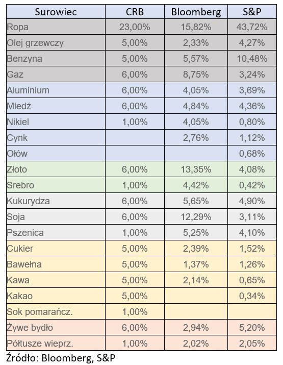 Powyższa tabela prezentuje przybliżone składy indeksów. Jak widać różnią je nie tylko wagi poszczególnych surowców, ale także sam skład. Tak, sok pomarańczowy w indeksie CRB to ten sam sok, który odegrał ważną rolę w filmie „Nieoczekiwana zmiana miejsc” („Trading Places”). Najstarszy z tych indeksów, CRB, ma stałą strukturę od kilkudziesięciu lat i co miesiąc podlega rebalancingowi. Pozostałe dwa odnoszą się do wartości rynków i obrotu tymi surowcami. To czego nie widać w tabelach, a co utrudnia porównywalność, jest korzystanie z różnych sposobów określania ceny. W przypadku CRB wycenie służy aktywny kontrakt ale w ciągu pierwszych czterech dni następnego miesiąca, po 25% kontraktów na dany surowiec jest rolowana na kolejny kontrakt. Z kolei w indeksie S&P rolowanie kontraktów następuje począwszy od 5 dnia następnego miesiąca i przez cztery dni wagi starego i nowego kontraktu w wycenie zmieniają się w relacji: 80/20, 60/40, 40/60 i 20/80. Sam indeks podlega rebalancingowi co kwartał.