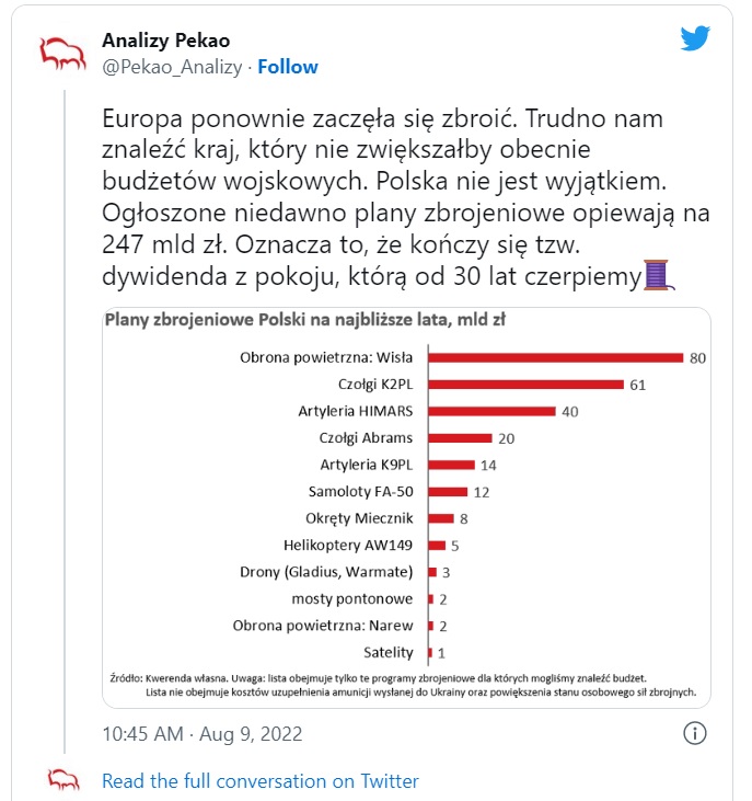 Ekonomiści Pekao wyjaśniają, że zbrojenie się państw to przede wszystkim zmiana struktury gospodarki: wzrost udziału przemysłu zbrojeniowego oraz szeroko rozumianego sektora publicznego kosztem sektorów cywilnych.