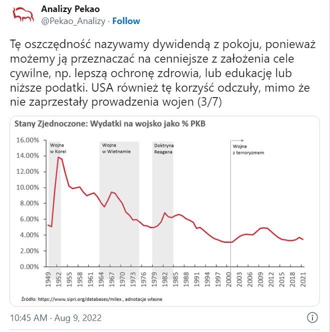 Ekonomiści Pekao wyjaśniają, że wydatki na zbrojenia są dla większości państw ekwiwalentem usługi ubezpieczeniowej. - Płacimy za nie, bo boimy się wojny i chcemy się przed nią zabezpieczyć, ale bezpośrednich korzyści z samych zbrojeń nie mamy - zwłaszcza, jeśli liczymy na odstraszanie przeciwników, a nie na realne użycie naszego potencjału militarnego - wskazują i dodają, że właśnie dlatego pokojowo nastawione społeczeństwa nie chcą tak naprawdę wydawać dużo na zbrojenia i wolą przeznaczać środki publiczne na inne cele: np. ochronę zdrowia, lub edukację.