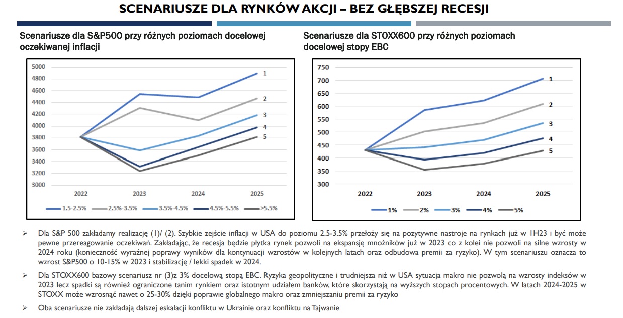 - Oczekujemy, że S&P500 powinien zakończyć rok 2023 na poziomie ok. 4200-4400 (+10-15 proc.) natomiast dla indeksu STOXX600 zakładamy scenariusz minimalnego wzrostu 0-5 proc. Pozytywny scenariusz zakłada udaną walkę z inflacją, jednak należy pamiętać, że wyceny na rynkach nie dają dużego dalszego potencjału wzrostu, biorąc pod uwagę nowe znormalizowane poziomy stóp procentowych (szczególnie w USA). Jeżeli nie pojawią się nowe ryzyka polityczne wówczas możliwy jest silniejszy ruch już od początku roku antycypujący przyszłe działania Fedu — prognozują specjaliści Opti TFI.