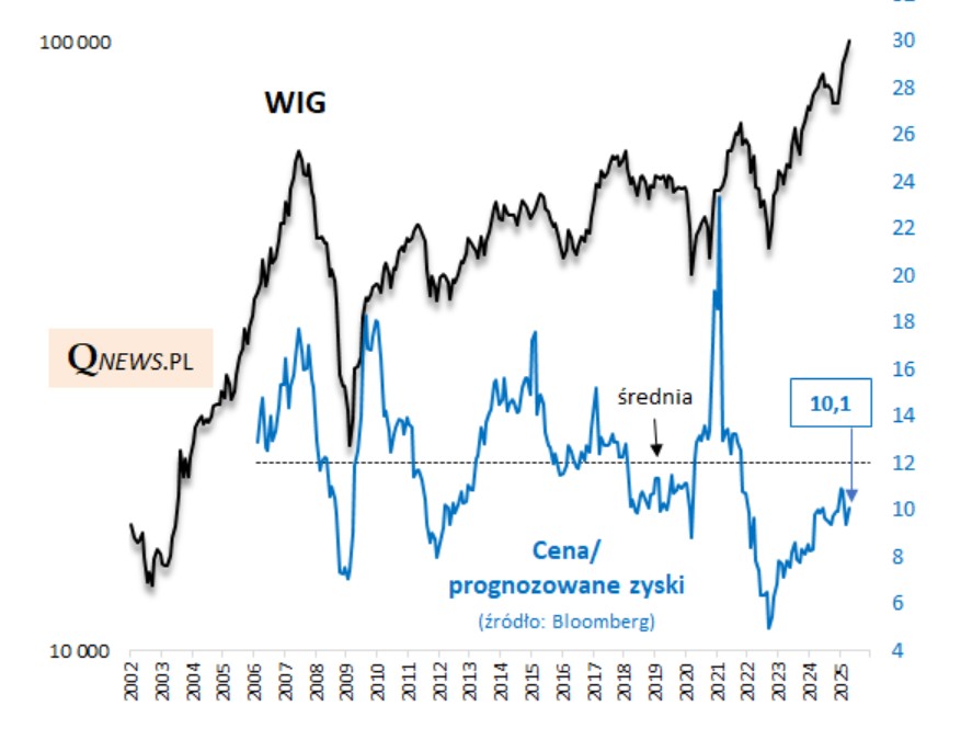Mniej problematyczne są wnioski płynące z obserwacji kolejnego – najpopularniejszego chyba – wskaźnika, czyli P/E (cena/prognozowane zyski spółek). Z danych Bloomberga wynika, że jest on nadal wyraźnie poniżej historycznej średniej – to by sugerowało, że akcje na GPW są z kolei relatywnie tanie.