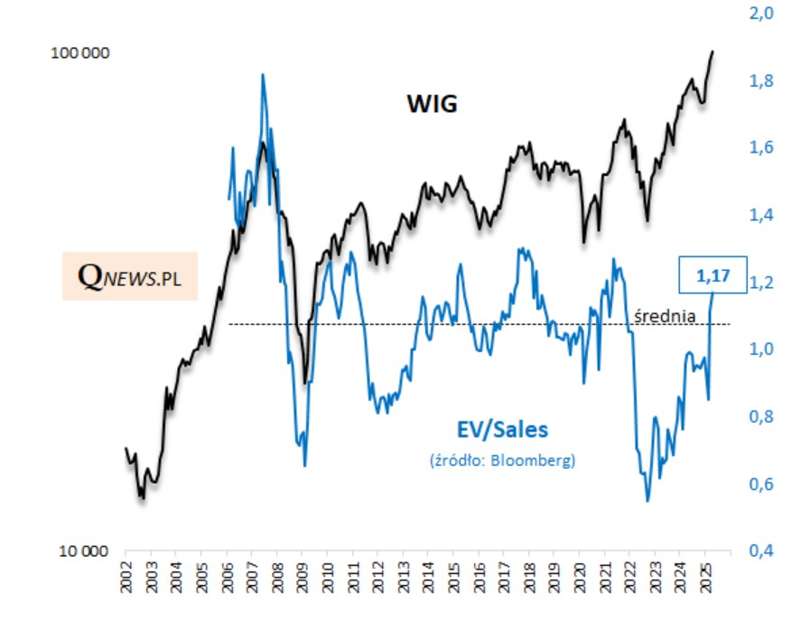 Na koniec jeszcze EV/Sales (EV/Przychody spółek ze sprzedaży). Tutaj wnioski są wypośrodkowane – współczynnik jest już wyraźnie powyżej średniej, ale jeszcze poniżej serii szczytów z ostatnich kilkunastu lat i jednocześnie sporo poniżej ekstremum z 2007 roku.