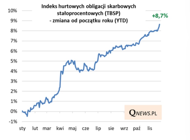 – Raptem w październiku pisałem o tym, że indeks TBSP, gromadzący tzw. hurtowe (sprzedawane na przetargach, a potem notowane na rynku wtórnym) obligacje skarbowe o stałym oprocentowaniu, znalazł się 7% na plusie od początku roku. Teraz, gdy końca dobiega listopad, stopa zwrotu liczona od początku roku jest już coraz bliżej progu +9% (na razie doszła do 8,7%) – pisze Tomasz Hońdo, CFA, zarządzający Quercus TFI.