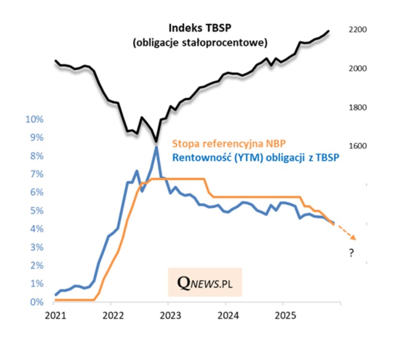 Na poniższym wykresie Tomasz Hońdo przypomina, jak kluczowe znaczenie dla obligacji stałoprocentowych ma kierunek zmian poziomu stóp. Kiedy RPP agresywnie podnosiła stopy (jesień 2021 – połowa 2022), indeks TBSP przeżył bezprecedensową w swej historii bessę, bo wyższe stopy popchnęły w górę przyszłą rentowność obligacji, a wyższa rentowność to automatycznie niższe ceny instrumentów stałoprocentowych.