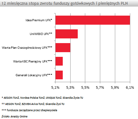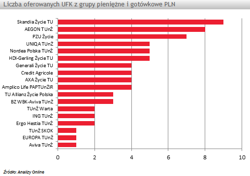 Ubezpieczyciele oferujący UFK gotówkowe i pieniężne posiadają od 1 do 9 funduszy tej grupy. Liderem pod tym względem jest Skandia Życie TU z 9 produktami (w tym dwoma własnymi: Skandia Fundusz Depozytowy 3 UFK i Skandia Fundusz Depozytowy 1 UFK), zaraz za nim uplasował się AEGON TUnŻ z 8 produktami w ofercie (wszystkie są unit-linkami). Jeśli po UFK gotówkowo-pieniężny wybierzemy się do Aviva TUnŻ, TUnŻ SKOK i EUROPA TUnŻ nie będziemy mieli specjalnego wyboru, gdyż i ubezpieczyciele posiadają z tej grupy po 1 produkcie. Warto zauważyć, że pierwszych dwóch ubezpieczycieli posiada 1 fundusz, ale jest to produkt ich własny, a nie unit-link. Mowa tu o Aviva Pieniężny UFK i SKOK Ryku Pieniężnego UFK.