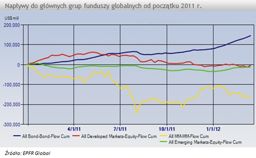 Według danych EPFR Global, w drugim tygodniu marca, saldo wpłat i umorzeń dla globalnych funduszy obligacji wyniosło +7,6 mld USD. Oznacza to kolejny rekordowy napływ środków do tego segmentu. Analitycy tej instytucji podkreślają, że działo się tak pomimo, że stopy zwrotu z inwestycji w papiery o stałym dochodzie uległy pogorszeniu w związku z przeprowadzeniem ostatnich operacji płynnościowych.