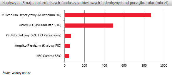 Zdecydowana większość środków napływa obecnie do zaledwie 2 funduszy. Millennium Depozytowy (Millennium FIO) oraz UniWIBID (UniFundusze SFIO) od stycznia do kwietnia br. osiągnęły nadwyżki wpływów nad umorzeniami na poziomie odpowiednio +869 mln oraz +491 mln zł. Są to wysokie kwoty, biorąc nawet pod uwagę, ostatnio znacznie chętniej kupowane przez klientów fundusze dłużne. Poza tym, w pierwszej piątce funduszy, które od początku br., przyciągały per saldo najwięcej nowych środków od klientów TFI, znalazły się jeszcze PZU Gotówkowy (PZU FIO Parasolowy), Amplico Pieniężny (Krajowy FIO) i KBC Gamma SFIO. Pozyskały one odpowiednio +65 mln, +53 mln oraz +46 mln zł.