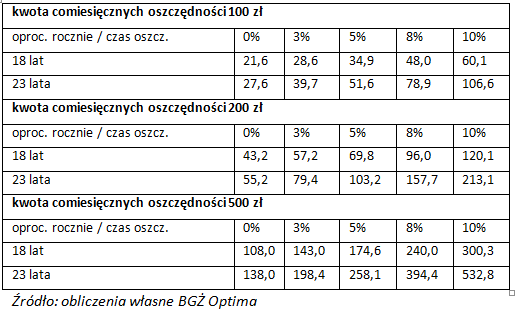 Mitem jest, że długoterminowe oszczędzanie jest przeznaczone tylko dla zamożnych. Kluczem do sukcesu jest systematyczność, a nie wysokość kwoty. Odkładając na przyszłość dziecka co miesiąc 100 zł, zainwestujemy do ukończenia przez niego studiów 27,5 tys. zł, ale z oprocentowaniem 5 proc. będzie to 51,5 tys zł, a przy 8 proc. prawie 79 tys. zł. Gdyby tak inwestycja była wyjątkowo udana i przyniosła 10 proc. zwrotu rocznie, zaoszczędzona kwota wzrośnie do 106,5 tys. zł. Dla miesięcznych oszczędności na poziomie 200 zł będą to odpowiednio kwoty 55 tys. (środki zainwestowane), 103 tys. zł (5 proc.), 157,5 tys. zł (8 proc.) i 213 tys. zł (10 proc.). Ile dokładnie?