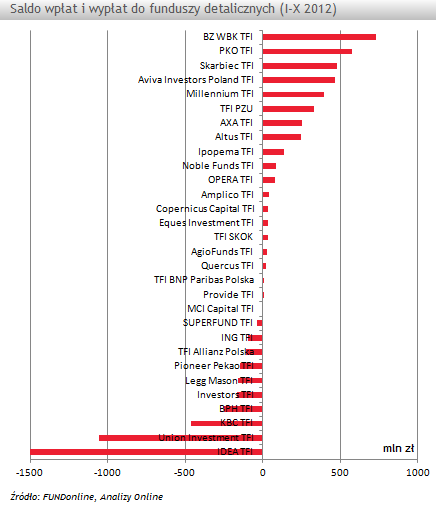 W październiku, po raz pierwszy od 6 miesięcy, saldo wpłat i wypłat do funduszy detalicznych, było dodatnie. Tegoroczny bilans sprzedaży dla tego segmentu rynku pozostaje jednak wciąż ujemny. Nie dla wszystkich TFI jest to jednak słaby rok. 19 na 30 towarzystw notuje w tym roku przewagę wpłat nad wypłatami. W 9-ciu przekracza ona +100 mln zł.