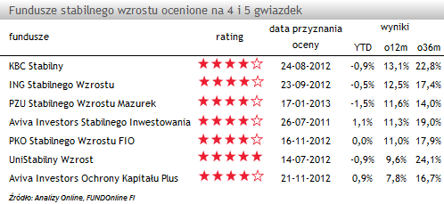 Wszystkie te fundusze wypracowały w ciągu ostatnich 12 miesięcy stopę zwrotu wyższą od średniej. Największą nadwyżką może się pochwalić KBC Stabilny, (+5,8 pkt proc. powyżej średniej), który utrzymuje swoją ocenę 4 gwiazdek od 2009 roku. Dobre wyniki to efekt synergii w portfelu funduszu między częścią udziałową oraz akcyjną. Fundusz legitymuje się najlepszą relacją zysku do ryzyka w swojej grupie (mierzony information ratio) dla okresów czasowych od roku do 3 lat.
