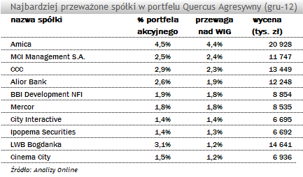 Według najnowszego sprawozdania widać, iż Quercus Agresywny nadal utrzymuje swój niebenchmarkowy charakter. Zarządzający (Sebastian Buczek i Bartłomiej Cendecki) nie boją się mocno niedoważać największych spółek z GPW. Udział akcji miedziowego giganta – KGHM był aż o -8,6% niższy niż w indeksie szerokiego rynku. Na koniec 2012 roku mocno niedoważone były również inne spółki wchodzące w skład indeksu WIG20, jak np. PKN Orlen, PGE, PKO BP, czy Pekao SA. Zarządzający funduszem wykazują selektywne podejście i chętnie stawiają na małe i średnie spółki. Mniejszą popularnością cieszą się przedsiębiorstwa przemysłowe z branży energetycznej i paliwowej. Największą grupę w portfelu akcyjnym funduszu Quercus Agresywny stanowią firmy działające w sektorze konsumenckim. Wśród 3 spółek najbardziej przeważonych względem WIG znajdziemy Amicę, producenta sprzętu AGD oraz CCC producenta i dystrybutora obuwia. Sebastian Buczek i Bartłomiej Cendecki nie bali się kupować akcji zeszłorocznych debiutantów z GPW. W portfelu akcyjnym funduszu znajdziemy walory Alior Banku, ZE PAK i Solara. Wymienione spółki zostały przeważone względem indeksu WIG.