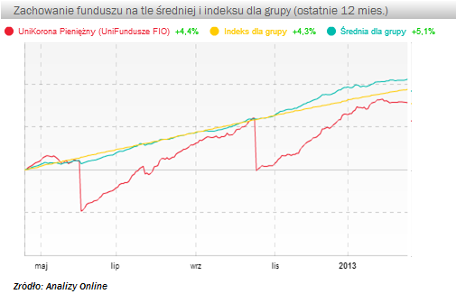 Jednak w przypadku UniKorona Pieniężny sytuacja przedstawiała się odmiennie. Pomimo że od czerwca do końca grudnia 2012 roku klienci wycofali aż -810 mln zł (spadek aktywów do poziomu 893 mln zł), aktywna polityka inwestycyjna pozwoliła z sukcesami kontynuować walkę o wynik. Fundusz nie tylko dynamicznie odrabiał straty, ale również nie tracił kontaktu z czołówką. Problemy PBG znów dały się we znaki – w październiku 2012 roku TFI dokonało kolejnego, tym razem już ostatecznego odpisu wartości obligacji PBG. Ponownie przełożyło się to na znaczny spadek wartości jednostki, rzędu -2,43% i wymusiło na zarządzających aktywne odrabianie strat. Ostatecznie rok udało się zakończyć na dobrym 8 miejscu wśród 28 rozwiązań, z przewagą nad średnią rzędu +0,5 pkt proc. Warto przy tym zaznaczyć, że same odpisy związane z PBG „zabrały” jednostce blisko -4,5%.