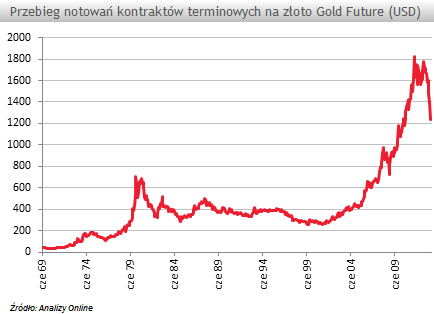 Dokładnie w połowie kwietnia inwestorzy po raz pierwszy w tym roku odczuli mocne spadki na rynku surowców i metali. W ciągu jednej sesji cena złota spadła o ponad -9%. Tak mocna przecena przerwała trwającą od 12 lat hossę na tym rynku, w trakcie której cena złota urosła 6-krotnie. Śmiało możemy ją porównać do tej z lat 70-ych, kiedy ostatecznie zniesiono system monetarny z Breton Woods, polegajcy na tym, że podaż pieniądza w gospodarce uzależniona była od rezerw złota. Na kolejne spadki na rynku nie musieliśmy długo czekać. Pod koniec czerwca za uncję złota płaciliśmy już tylko 1200 USD, czyli najmniej od sierpnia 2010 r. Od początku kwietnia cena złotego kruszcu spadła już niemal o -30%. Jest to najgorszy kwartał od 1968 roku.