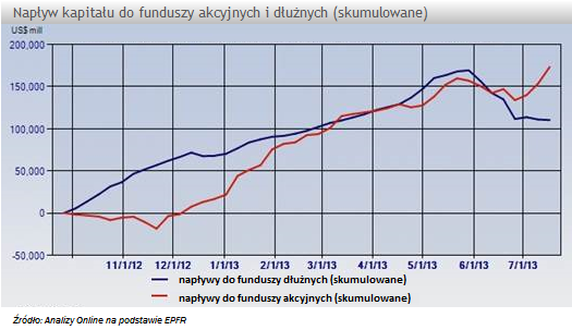 Eksperci zwracają uwagę na słabnącą chińską gospodarkę. W zeszłym tygodniu poznaliśmy dane dotyczące chińskiego PKB w drugim kwartale 2013 roku. Wzrost gospodarczy zmalał do +7,5% – najniższego poziomu od marca 2009 roku. Nie dziwi zatem fakt, iż blisko 65% menedżerów spodziewa się słabnącej dynamiki PKB Państwa Środka w ciągu najbliższego roku. Zdaniem Michaela Hartnett’a, głównego stratega inwestycyjnego Bank of America Merrill Lynch, słabe dane z Chin powinny tym bardziej zachęcić inwestorów do inwestycji na rozwiniętych rynkach akcji. John Bilton – europejski strateg inwestycyjny amerykańskiego banku, zwraca uwagę, że globalni inwestorzy powinni wkrótce przekonać się również do inwestycji w krajach strefy euro.