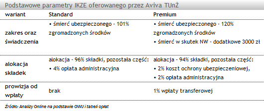 Z pierwszej formy skorzystała m.in. Aviva TUnŻ oferując IKZE w dwóch wariantach: Standard oraz Premium. W każdym z nich składka może być opłacana z częstotliwością miesięczną, kwartalną, półroczną, roczną lub nieregularnie. Pierwsza i każda kolejna wpłata do programu wynosi 55 zł/miesiąc dla wpłat regularnych, dla nieregularnych zaś pierwsza wpłata to co najmniej 250 zł, a kolejne 50 zł. W wariancie Premium dodatkowo obowiązuje warunek, iż minimalna kwota inwestycji dla każdego 3-letniego okresu wynosi 2000 zł. W zamian możemy liczyć na rozszerzony zakres ochronny umowy, który wiąże się jednak z wyższymi kosztami. Istnieje możliwość zmiany wariantu, ale tylko z Premiowego na Standardowy.