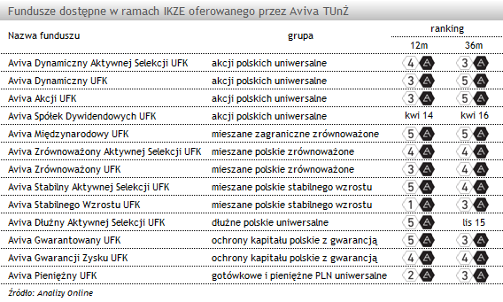 IKZE Avivy oparte jest na 13 funduszach zarządzanych przez własny zespół zarządzających. Klienci mają do wyboru 4 fundusze akcji polskich, 5 rozwiązań o mieszanej strategii, w tym 1 zagraniczny oraz 4 o niższym poziomie ryzyka. Są to w większości dobre rozwiązania, które nierzadko plasują się w pierwszym kwartylu rocznych stóp zwrotu, a w naszych comiesięcznych rankingach zazwyczaj otrzymują dobre oceny, na poziomie co najmniej 3a (neutralnym). W najnowszym rankingu niższe oceny otrzymały jedynie Aviva Stabilnego Wzrostu UFK oraz Aviva Pieniężny UFK.