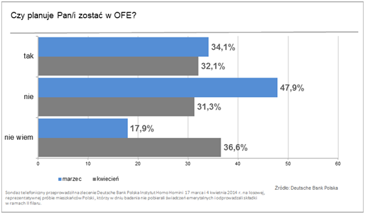 Z badań opinii przeprowadzonych na zlecenie Deutsche Bank wynika, że jedna trzecia Polaków, którzy nie ukończyli 64 roku życia, nie są obecnie na emeryturze i w momencie przeprowadzenia badania należeli do OFE, ma zamiar w dalszym ciągu przekazywać część swojej składki emerytalnej do Funduszy (w obu badaniach odpowiednio 32 i 34 proc.). Co ciekawe, w marcu niemal połowa respondentów (48 proc.) chciała, aby ich składki trafiały w całości do ZUS, a 18 proc. nie potrafiło jeszcze wskazać, które rozwiązanie docelowo wybierze. Tymczasem w kwietniu odsetek takich osób, które zdecydowane są odprowadzać składki tylko do ZUS wyniósł już tylko 31 proc. Równocześnie znacząco (do niemal 37 proc.) wzrosła liczba osób, które nie wiedzą jeszcze jaką opcję wybrać.
