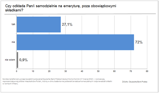 Zdaniem Moniki Szlosek z Deutsche Bank, dzieje się tak, ponieważ bardziej zamożni mają większą słoność do dywersyfikacji swoich oszczędności emerytalnych i już dziś częściej odkładają samodzielnie, poza obowiązkowymi składkami. W badaniach Deutsche Bank ok. 90 proc. osób osiągających miesięczne zarobki powyżej 5 tys. zł zadeklarowało, że gromadzi oszczędności we własnym zakresie. – Grupa respondentów dysponujących ponadprzeciętnym dochodem ma większe możliwości samodzielnego zabezpieczenia dostatniej emerytury. Stąd być może mniejsze znaczenie ma dla niej to, jakie świadczenie uzyska w ramach systemu emerytalnego - mówi Monika Szlosek.