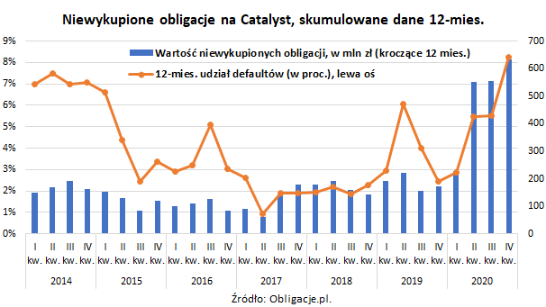Notowane na Catalyst firmy nie spłaciły w ubiegłym roku obligacji wartych 631,8 mln zł. To kwota stanowiąca 8,2 proc. zapadających w tym czasie papierów wobec okolic 2-3 proc. w latach 2016-2019 i 7 proc. w najgorszym dotychczas 2014 r. W minionym roku średnio co dziesiąta seria wygasającego złotowego długu kończyła się brakiem wykupu.
