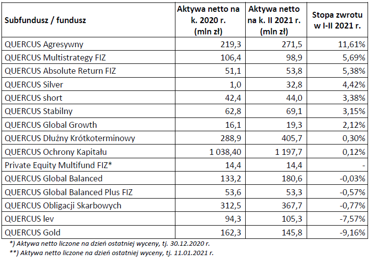 Na wartość aktywów pod zarządzaniem na koniec lutego 2021 r. składało się 2 839,6 mln zł ulokowanych w 11 subfunduszach QUERCUS Parasolowy SFIO, 53,8 mln zł w funduszu QUERCUS Absolute Return FIZ, 53,3 mln zł w funduszu QUERCUS Global Balanced Plus FIZ, 22,6 mln zł w Acer Aggressive FIZ, 98,9 mln zł w QUERCUS Multistrategy FIZ, 14,4 mln zł w Private Equity Multifund FIZ*, 91,3 mln zł w Alphaset FIZ** oraz 173,1 mln zł aktywów w ramach usługi asset management (bez uwzględnienia środków zainwestowanych w subfundusze / fundusze QUERCUS). wyceny, tj. 30.12.2020 r.