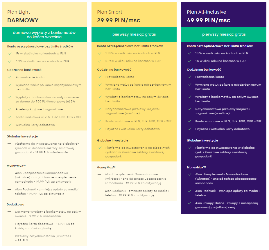 Aion Bank udostępnił klientom trzy Plany ze stałą miesięczną opłatą z pakietem różnych usług. Im droższy Pakiet, tym więcej usług jest bezpłatnych. Najprostszy jest Plan Light, który jest darmowy, kolejne to Smart (29,99 zł / mies.) i All Inclusive (49,99 zł / mies.).