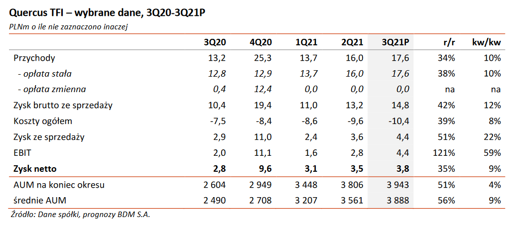 We wtorek Quercus TFI opublikuje raport okresowy za III kwartał. Analitycy DM BDM przewidują, że zysk netto wzrośnie o ponad jedną trzecią, a success fee wzrośnie.