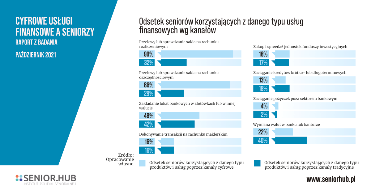 - Z badania wynika, że wśród seniorów „cyfrowych” 90% sprawdza elektronicznie swoje saldo na rachunku rozliczeniowym, a 86% dokonuje przelewów online. Lokaty drogą elektroniczną zakłada 48% seniorów cyfrowych, a kilkanaście procent zaciąga tą drogą kredyty, czy inwestuje z wykorzystaniem rachunku maklerskiego. Wśród seniorów bez kompetencji cyfrowych jedynie 32% sprawdza swoje saldo na rachunku w oddziale banku, co wskazuje, że osoby te mają znacznie mniejszą kontrolę nad swoimi środkami finansowymi. Uzależnione od kanałów tradycyjnych, wymagających wypraw do punktów obsługi klienta czy przynajmniej korzystania z infolinii, powoduje mniejszą aktywność w zakresie kontroli wydatkowania własnych środków i podejmowania działań w zakresie inwestycji.