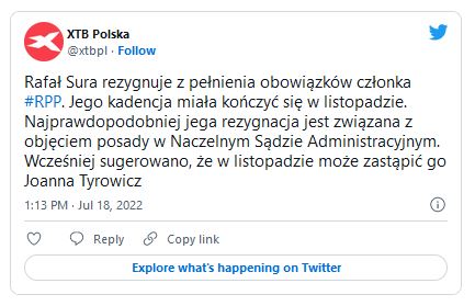 Zaledwie na 4 miesiące przed wygaśnięciem kadencji Rafał Sura odchodzi z RPP. Decyzja ma być podyktowana nowymi obowiązkami w Naczelnym Sądzie Administracyjnym.