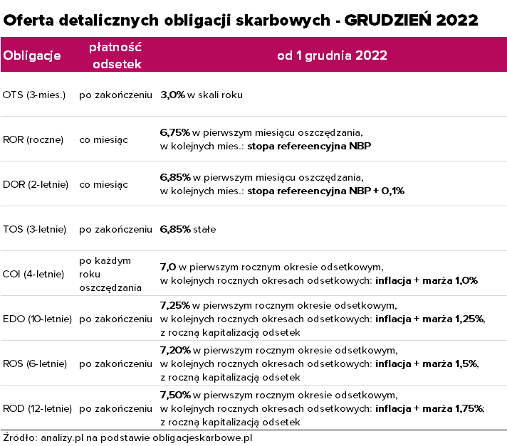 – W grudniu oprocentowanie 1-rocznych obligacji zmiennoprocentowych wyniesie 6,75% a 2-letnich 6,85%. Oprocentowanie obligacji stałoprocentowych 3-mies. będzie wynosić 3,0% w skali roku, a 3-letnich 6,85%. Pozostałe obligacje, w pierwszym okresie odsetkowym, oprocentowane będą odpowiednio: 7,0% dla 4-latek oraz 7,25% dla 10-latek – czytamy w komunikacie.