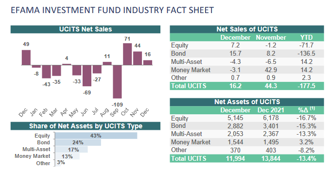 W 2022 roku europejskie fundusze UCITS (otwarte) i AFI (zamknięte) odnotowały odpływ środków netto na poziomie 278 mld EUR, w porównaniu do napływu netto w wysokości 888 mld EUR w 2021 r. Aktywa netto europejskich funduszy inwestycyjnych spadły o 12,4% i znalazły się poniżej progu 20 bln EUR.