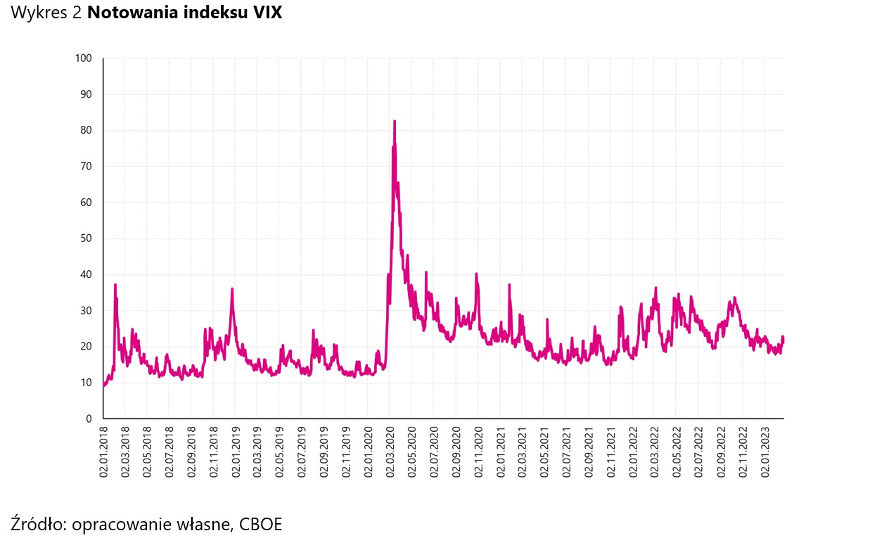 Ekspert zauważa, że na początku roku VIX nie wykazywał specjalnych oznak mogących świadczyć o nerwowości inwestorów. Wartość wskaźnika przez większość stycznia i lutego znajdowała się blisko poziomu 20 pkt, będąc jednocześnie w okolicach kilkunastomiesięcznego minimum. Jednak w ostatnim tygodniu pojawiły się symptomy świadczące o zmianie dotychczasowej sytuacji. Wskaźnik zanotował wyraźny wzrost (przede wszystkim podczas wtorkowej sesji), docierając do najwyższych poziomów od grudnia 2022 r.