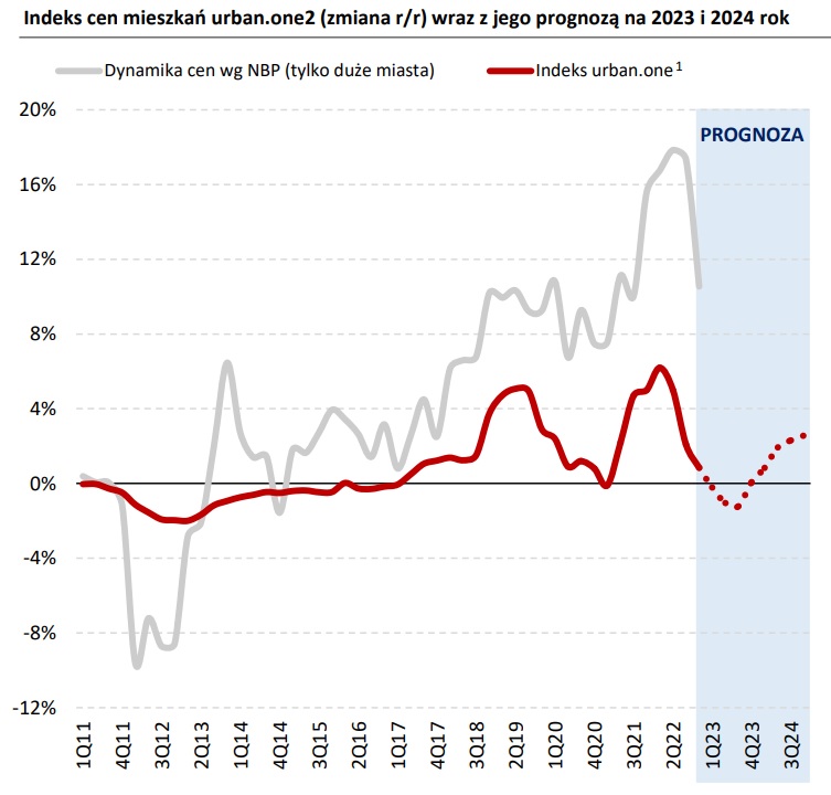 - W I połowie tego roku możemy obserwować delikatne spadki w ujęciu kw./kw. cen mieszkań sprzedawanych na rynku pierwotnym, co w II półroczu może zbliżyć ich dynamikę r/r w okolice zera. Barierą dla spadku cen może okazać się jednak wciąż wysoka inflacja i łączne koszty budowy. Niemniej jednak na pewno zobaczymy w bieżącym roku (podobnie jak miało to miejsce już w IV kw. 22) spadek realnych cen nieruchomości mieszkaniowych, co samo w sobie będzie zjawiskiem nie obserwowanym od wielu lat - prognozują analitycy. - Zakładamy, że w II połowie 2023 r., a najpóźniej w I połowie 2024 r. spadkowy trend zmian cen kw./kw. ulegnie ponownemu odwróceniu pod wpływem stopniowo poprawiającej się sytuacji popytowej. Do wyraźniejszych wzrostów w skali r/r cen (zwłaszcza w ujęciu realnym) rynek najpewniej powróci jednak dopiero w II lub III kwartale 2024 r. - dodają.