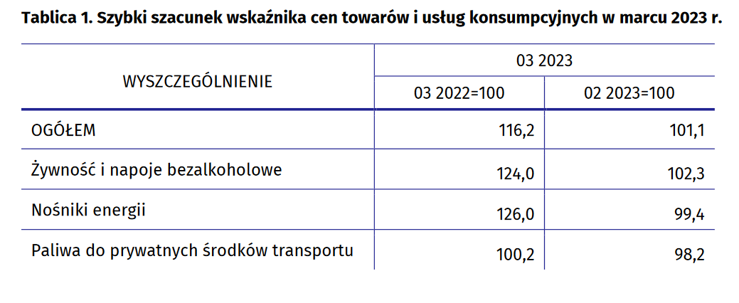 Jak informuje GUS, ceny towarów i usług konsumpcyjnych według szybkiego szacunku w marcu 2023 r. w porównaniu z analogicznym miesiącem ub. roku wzrosły o 16,2%, a w stosunku do poprzedniego miesiąca poszły w górę o 1,1%.