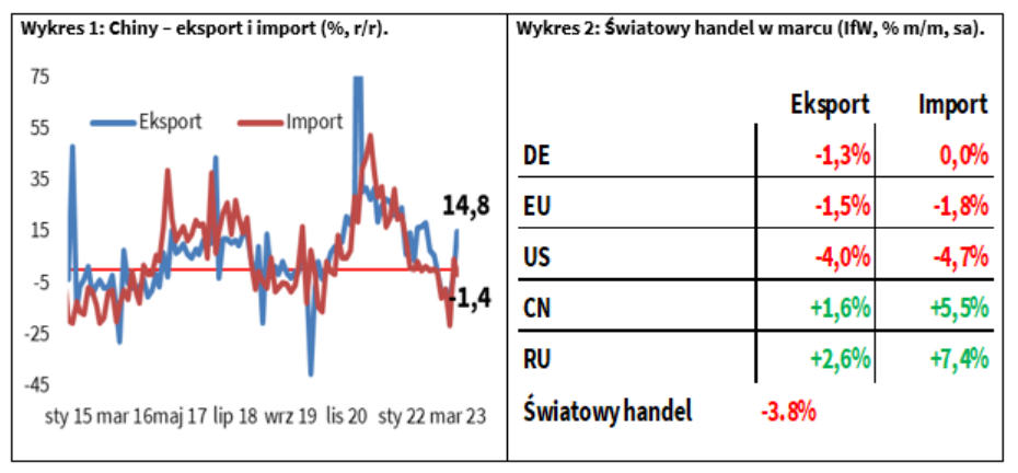 W marcu Chiny mocno zaskoczyły analityków wynikami handlu zagranicznego. Eksport Państwa Środka zwiększył się w ujęciu rocznym o 14,8% przy prognozach rynkowych wskazujących na jego 7-proc. spadek. Wcześniejsze złagodzenie restrykcji covidowych zaczyna przekładać się na poprawę wyników gospodarczych największej fabryki świata. Szacunki Instytutu Gospodarki Światowej (IfW) w Kilonii sugerują, że Chinom udało się znacząco poprawić obroty zagraniczne w marcu, pomimo spadku zagregowanego światowego handlu aż o 3,8% po słabych wynikach USA i Unii Europejskiej.