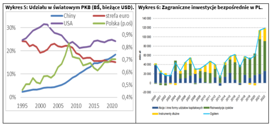 Nie oznacza to jednak, że rozpychające się Chiny zabierają całą przestrzeń w rozwijającej się gospodarce światowej. Przykładowo, udział Polski w tworzeniu globalnego PKB zwiększył się w latach 1995-2021 z 0,5% do 0,7% (w 2008 r. sięgał on nawet 0,8%, jednak potem zaczął spadać, by od 2017 r. znowu wejść na ścieżkę wzrostową). Polska jest coraz lepiej postrzegana przez firmy zagraniczne pod względem możliwości lokowania tu inwestycji i współpracy z krajowymi kooperantami. W marcowej ankiecie Polsko-Niemieckiej Izby Przemysłowo-Handlowej i IGCC (sieci międzynarodowych izb handlowych działających w Polsce) to właśnie nasz kraj wskazano jako najbardziej atrakcyjną lokalizację inwestycyjną dla biznesu wśród badanych państw Europy Środkowej, Wschodniej oraz Chin i Rosji. W ostatnim raporcie Reuters Events oraz A.P. Moller-Maersk, firmy z Europy, wskazały Polskę jako najlepszy kraj na świecie pod względem ewentualnej zmiany dostawców. Nie sprawdziły się też obawy o odstraszanie inwestorów w związku z tym, że staliśmy się krajem przyfrontowym. Jak pokazują wstępne dane NBP, w latach 2021-22 napłynęło do Polski rekordowo dużo bezpośrednich inwestycji udziałowych i reinwestowanych zysków, najwięcej z Holandii, Luksemburga i Niemiec.